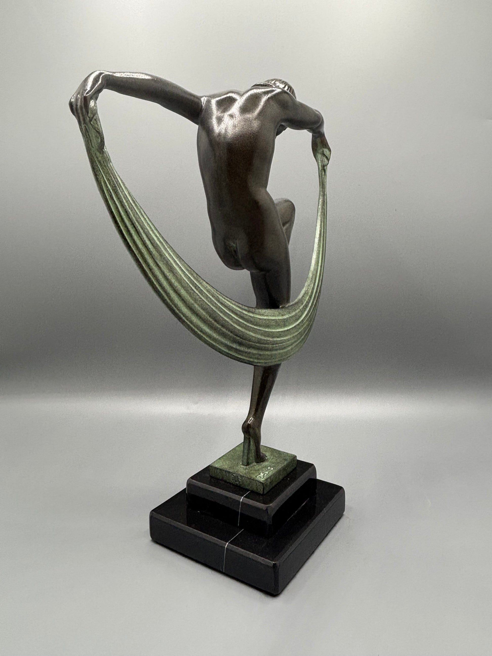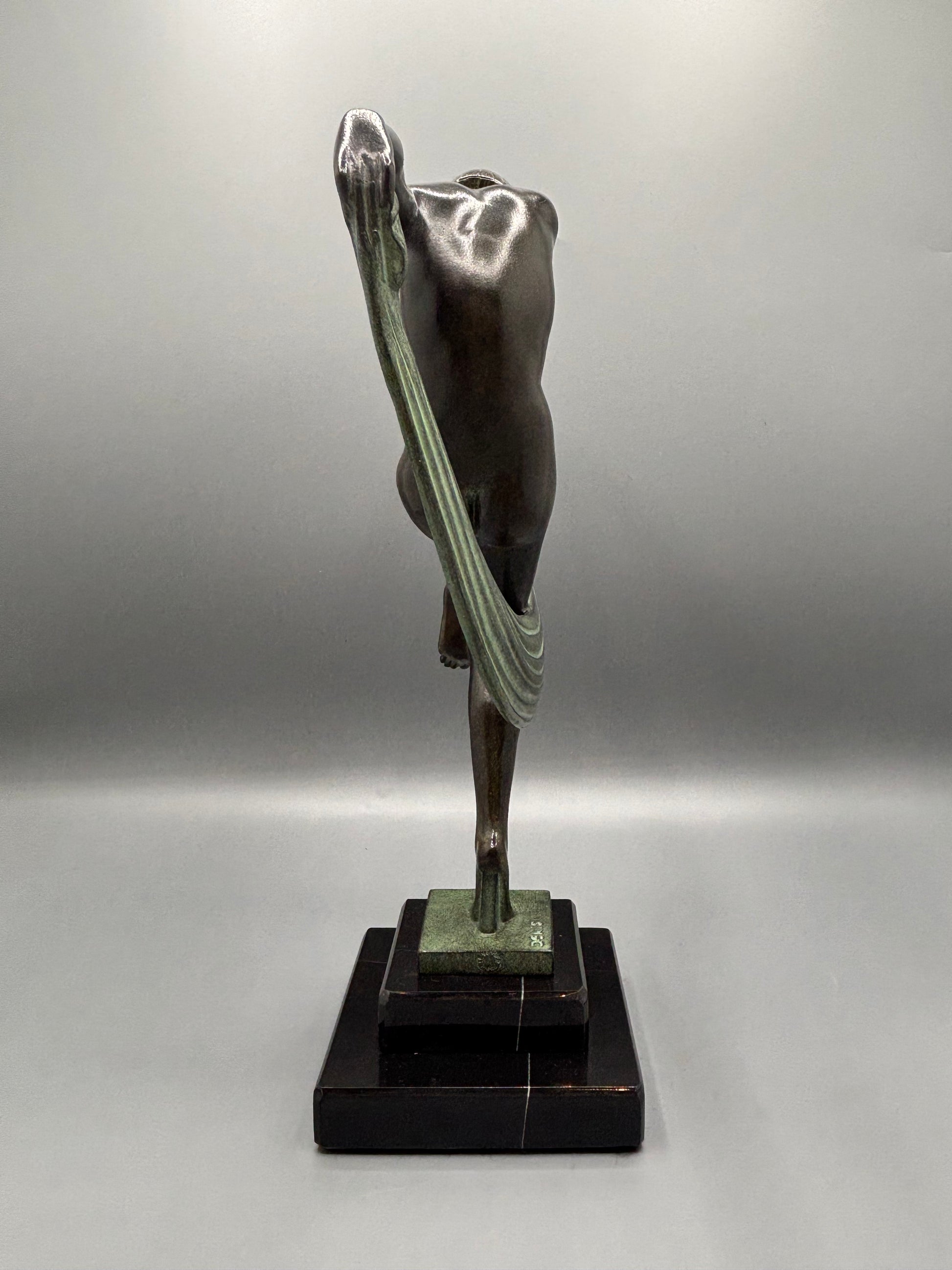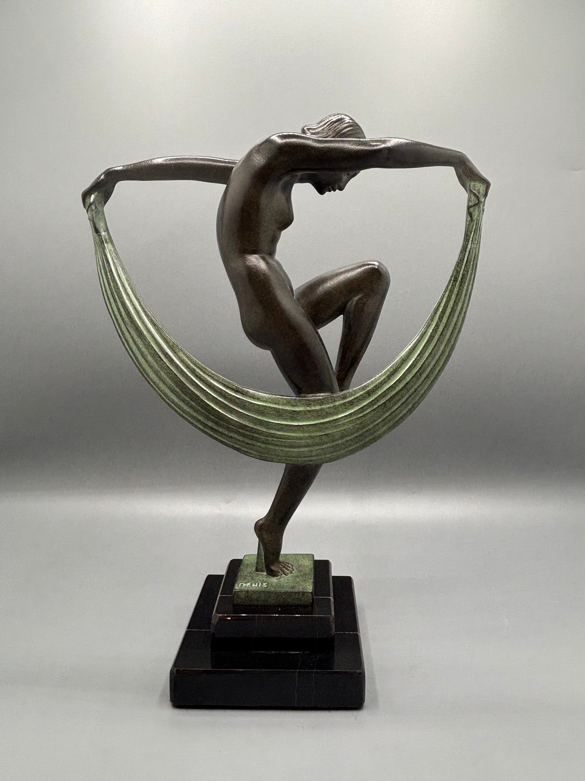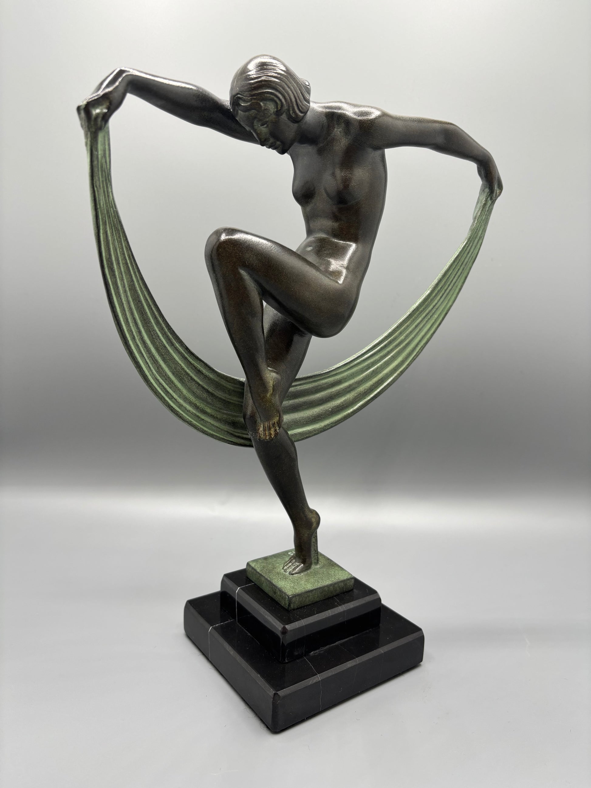 Danseuse aux voiles flottants, les bras déployés en mouvement gracieux, conçue vers 1930 et réalisée en métal d'art patiné sur socle en marbre.